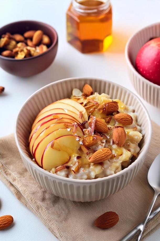 Wymieszaj płatki owsiane z mlekiem, a następnie dodaj jabłko (pokrojone w kostkę lub plasterki) oraz migdały kalifornijskie lub krojone prażone w miodzie. Dodatkowo możesz dodać odrobinę cynamonu, a całość polać miodem. To doskonałe źródło energii na początek dnia, wspomagające zarówno zdrowie, jak i utrzymanie zdrowego samopoczucia.